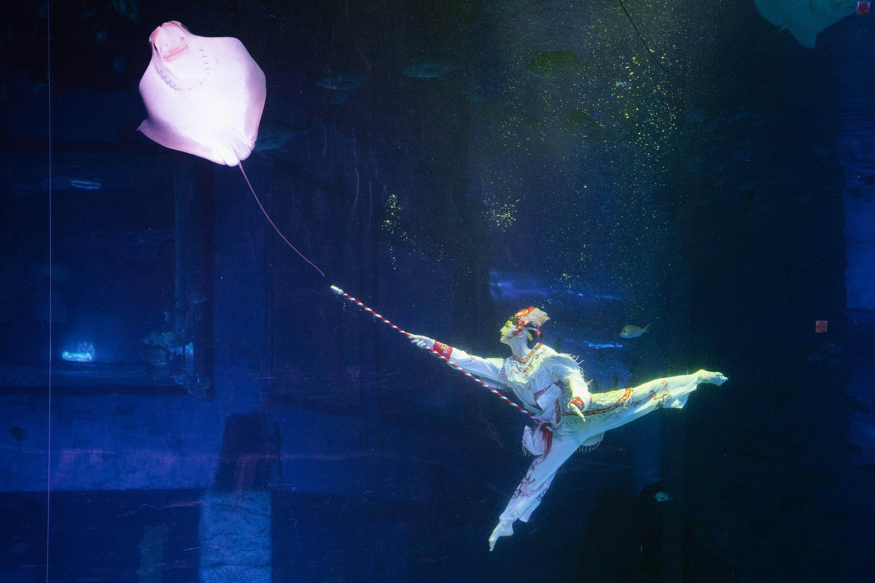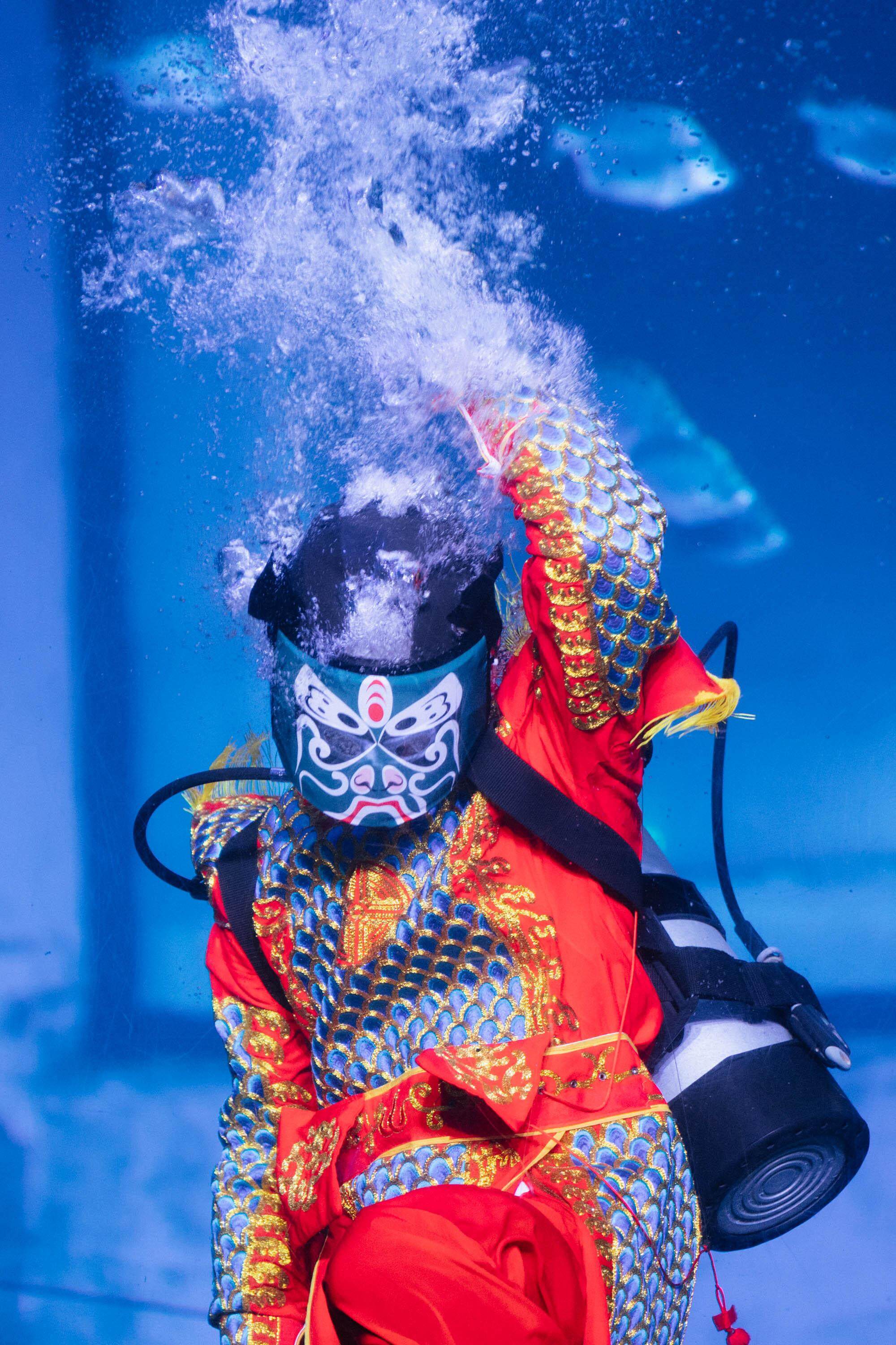 更令人叫绝的是,川剧变脸表演者也将潜入海底,在鱼群环绕中即兴变脸,从“黑面怒容”秒变“红脸笑颜”,短短几分钟变换八张脸谱,引发观众阵阵惊呼、喝彩。