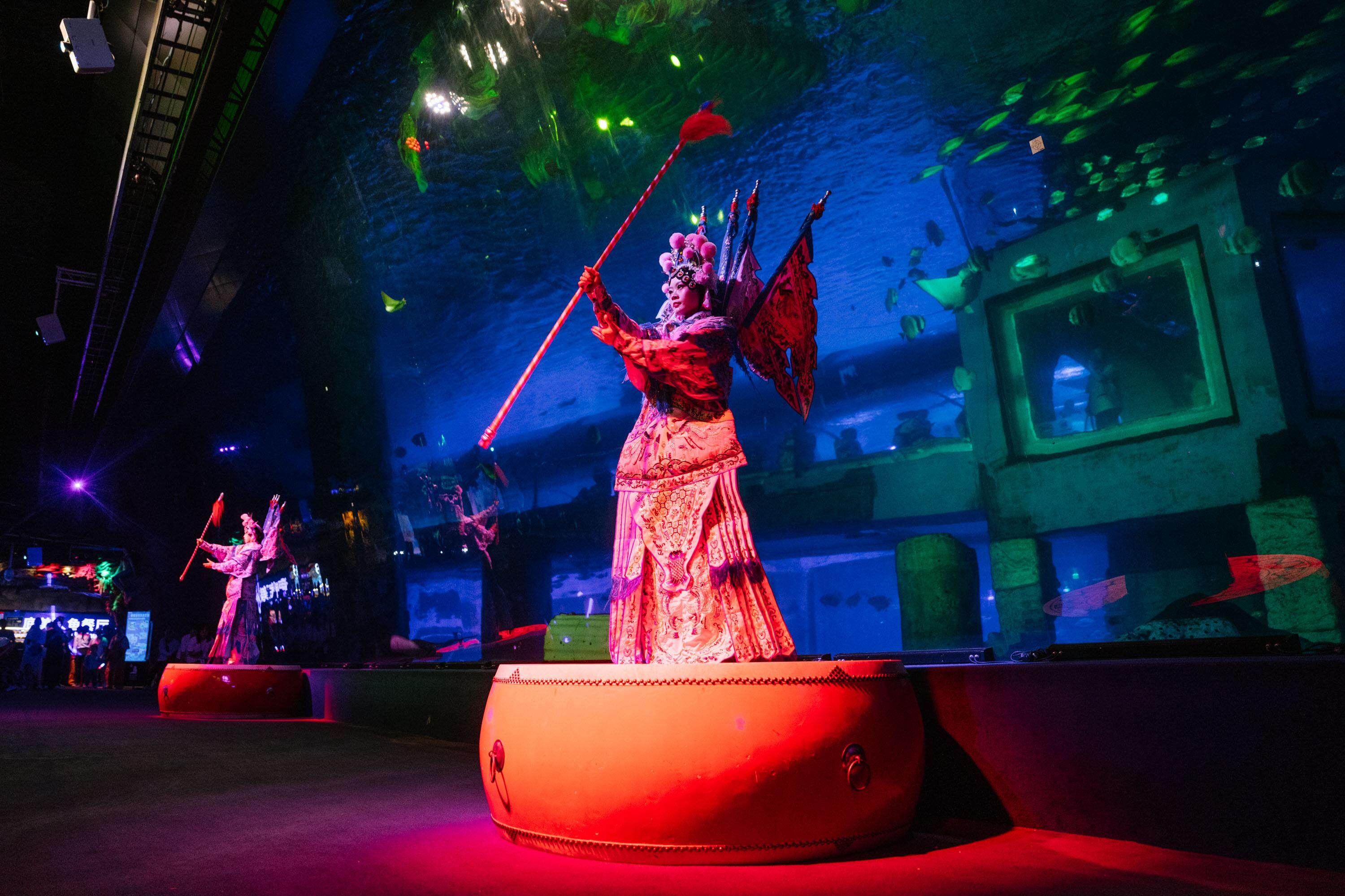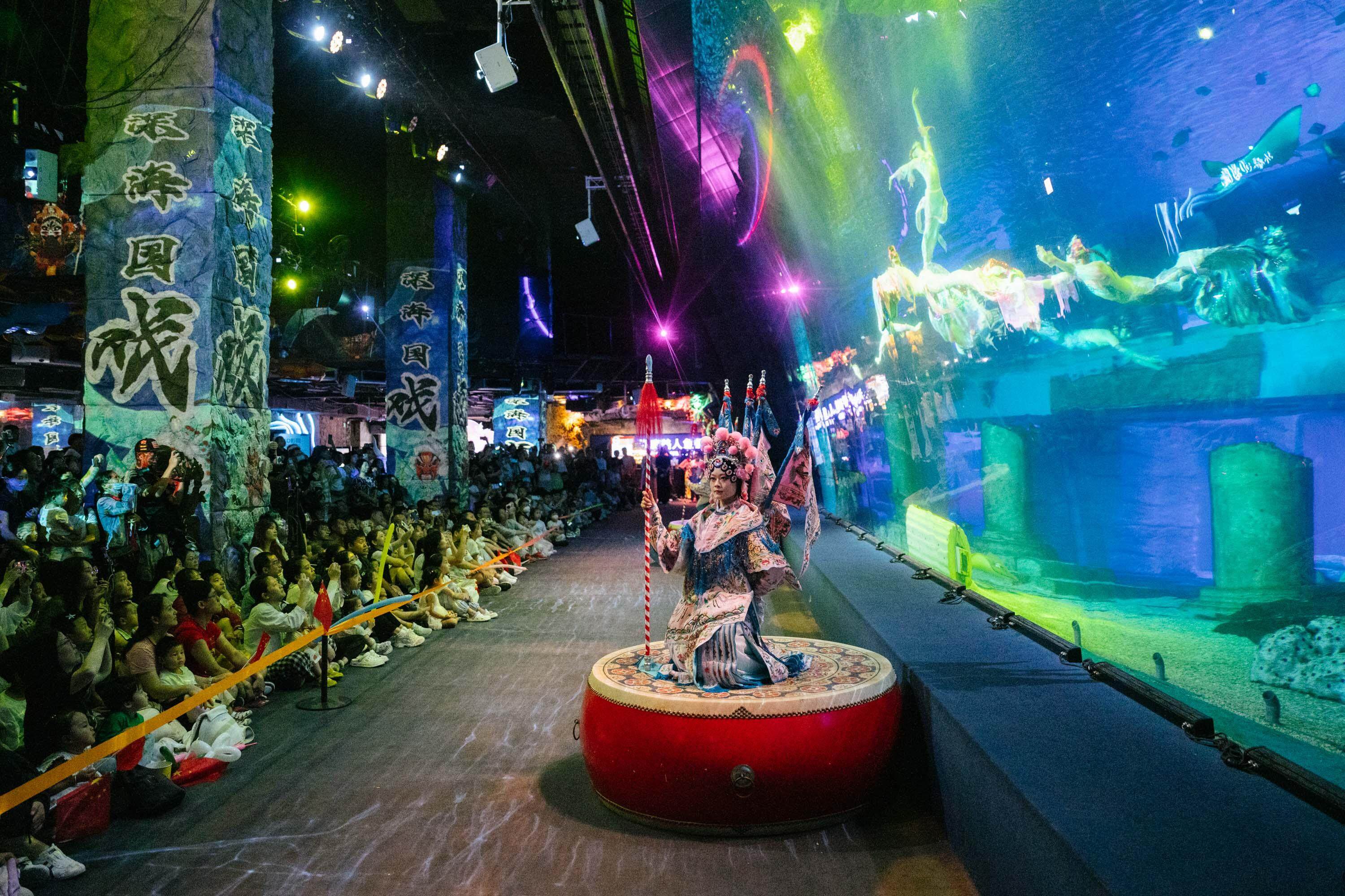 节日期间,正佳极地海洋世界推出国庆限定美人鱼大秀——《深海国戏》水下非遗大秀。当戏曲旋律在海底回荡,身着京剧刀马旦服饰的“东方美人鱼”手持花枪翩然起舞,尽显国粹风华。