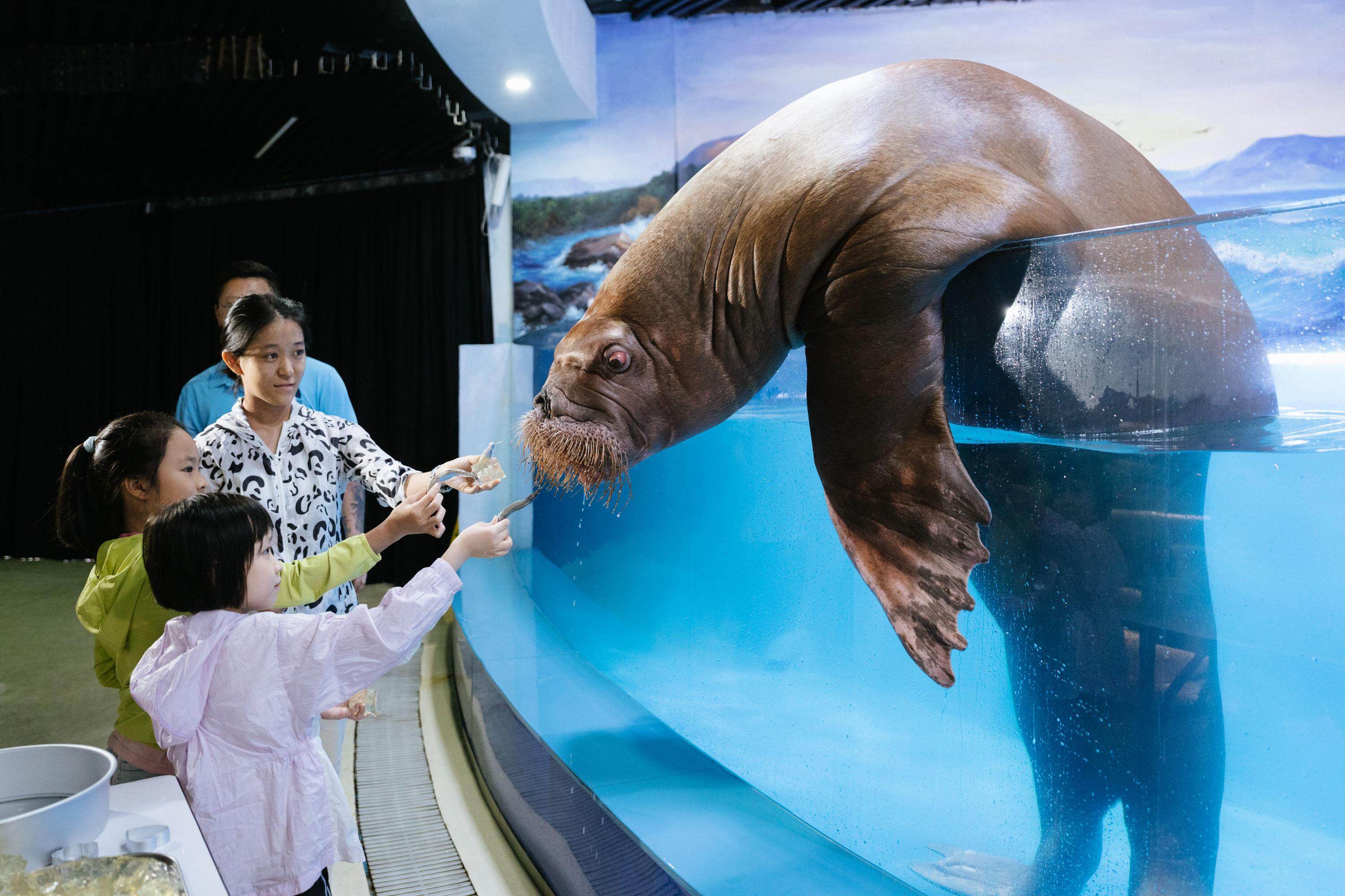 中秋氛围同样蔓延至动物世界。在饲养员的指导下,小朋友们可以亲手为海象制作特制果冻月饼,既寓意团圆,也为海象补充水分与营养。